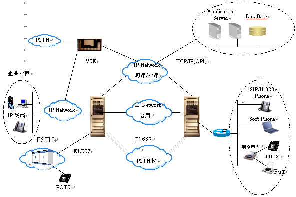 ESE/VSE作為電路到IP的接入網(wǎng)關(guān),可提供PSTN與IP網(wǎng)的互通。做為軟交換機(jī),可建設(shè)全I(xiàn)P方式的電話網(wǎng)絡(luò),并實現(xiàn)呼叫處理,路由,業(yè)務(wù)實現(xiàn)等功能。