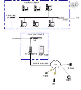 政府群眾一線通”系統可以通過局域網連入行政中心局域網交換機,從而實現與整個行政服務中心的信息共享和熱線系統服務內容的自動更新。具體網絡拓撲結構如下: