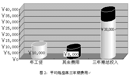 就中國(guó)目前的經(jīng)濟(jì)水平而言,一個(gè)座席人員年收入(包括工資、獎(jiǎng)金、福利等等)大約為¥10,000,而每個(gè)座席人員所配備的軟硬件設(shè)施合計(jì)約為¥5,000;據(jù)專業(yè)機(jī)構(gòu)統(tǒng)計(jì),中國(guó)的座席人員平均穩(wěn)定的工作年限為三年,而在這三年為了保證座席人員能夠準(zhǔn)確、高效的實(shí)現(xiàn)對(duì)用戶提供專業(yè)服務(wù),所投入的培訓(xùn)費(fèi)用大約為¥3,000。所以在三年期間為每個(gè)座席的平均花費(fèi)為¥38,000。