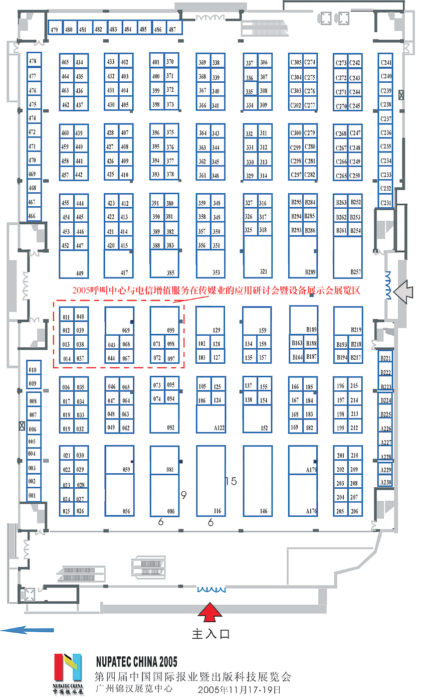 (圖中紅顏色邊框區(qū)為2005呼叫中心與電信增值服務(wù)在傳媒業(yè)的應(yīng)用研討會(huì)暨設(shè)備展示會(huì)展覽區(qū))