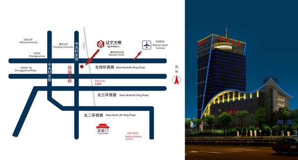 北京遼寧大廈位于北四環(huán)黃金地段,乘坐首都機(jī)場(chǎng)巴士即可到達(dá)。距譽(yù)有"中國(guó)硅谷"之稱的中關(guān)村信步可至,毗鄰北大清華,距中外聞名的奧運(yùn)場(chǎng)館"鳥巢"僅5分鐘車程。地理位置得天獨(dú)厚,交通便捷。