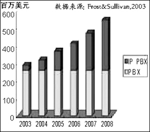 這幾年,IP電話的需求在不斷升溫,尤其在2003年呈快速增長趨勢。目前,全球IP電話市場容量每年為10億美元,預(yù)計到2008年,IP電話的市場份額將超過傳統(tǒng)的PBX。據(jù)思科公司溫帶策經(jīng)理介紹,思科在前4年,向全球銷售了100萬臺IP電話,而在2003財年僅僅一年時間里,就銷售了100萬臺IP電話。