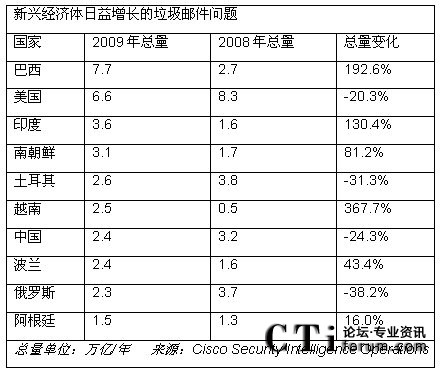 垃圾郵件:社交網(wǎng)站可能是網(wǎng)絡(luò)犯罪尋找新的受害者的地方。然而,垃圾郵件仍然是誘騙人們下載惡意軟件和慫恿他們購買諸如假藥等商品的可靠手段。《年度安全報(bào)告》估計(jì),2010年全球范圍的垃圾郵件量與2009年的水平相比,可能會增加30-40%。然而,思科自己的SensorBase數(shù)據(jù)顯示,美國和其他經(jīng)濟(jì)發(fā)達(dá)國家(例如歐盟內(nèi)部的國家)開始在他們各自的國家關(guān)閉垃圾郵件僵尸(spam zombies),而發(fā)展中國家(包括印度和越南)已經(jīng)成為垃圾郵件日益增長的源頭。事實(shí)上,美國不再是第一大垃圾郵件發(fā)送者。2009年巴西躍居第一。