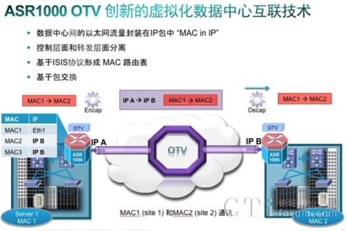 Cisco OTV技術(shù)可以為跨任意傳輸網(wǎng)絡(luò)的二層連接擴(kuò)展,提供運(yùn)營(yíng)優(yōu)化型解決方案。因此,OTV對(duì)于分布式數(shù)據(jù)中心的高效部署發(fā)揮著關(guān)鍵作用,有助于實(shí)現(xiàn)應(yīng)用可靠性和靈活的工作負(fù)載遷移。OTV是一項(xiàng)“MAC in IP”技術(shù)。通過(guò)使用MAC地址路由規(guī)則,OTV可提供一種疊加(overlay)網(wǎng)絡(luò),能夠在分散的二層域之間實(shí)現(xiàn)二層連接,同時(shí)保持這些域的獨(dú)立性以及IP互聯(lián)的容錯(cuò)性、永續(xù)性和負(fù)載均衡優(yōu)勢(shì)。 圖1說(shuō)明了這種工作機(jī)制。