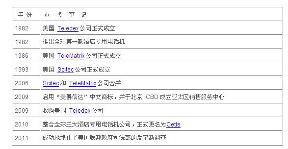 Cetis(美爵信達(dá)) 是全球酒店客房/辦公電話機(jī)的領(lǐng)導(dǎo)企業(yè),全球總部位于美國(guó)丹佛,在世界各地設(shè)有生產(chǎn)基地、銷售網(wǎng)絡(luò)及服務(wù)機(jī)構(gòu),并在全球擁有7000多家授權(quán)代理商。2009年12月18日,Cetis(美爵信達(dá))在全球 CEO 孫炳南博士的領(lǐng)導(dǎo)下,正式收購(gòu)了全球最大的酒店專用電話機(jī)公司—— 美國(guó)Teledex(德利達(dá))公司,成為世界上最大、擁有全球酒店客房話機(jī)三大頂級(jí)品牌公司的龍頭企業(yè)。