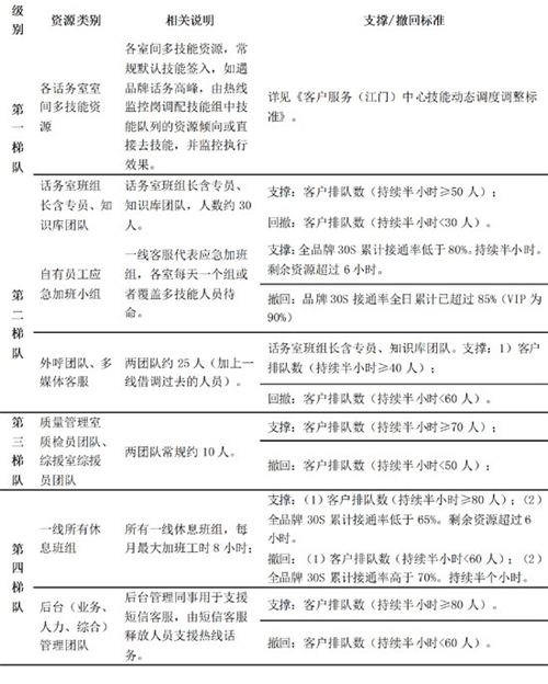 第一梯隊(duì):側(cè)重現(xiàn)有話務(wù)科室間“技能協(xié)同”,適度放棄某些品牌,重點(diǎn)保障某品牌;同時(shí)一線班組長和日常負(fù)責(zé)業(yè)務(wù)知識(shí)管理的同事入線,承接普通話務(wù)。