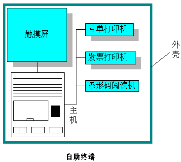 自助終端的結(jié)構(gòu)主要分為6個(gè)部分:主機(jī)、觸摸屏、條形碼閱讀機(jī)、號單打印機(jī)、發(fā)票打印機(jī)和外殼。