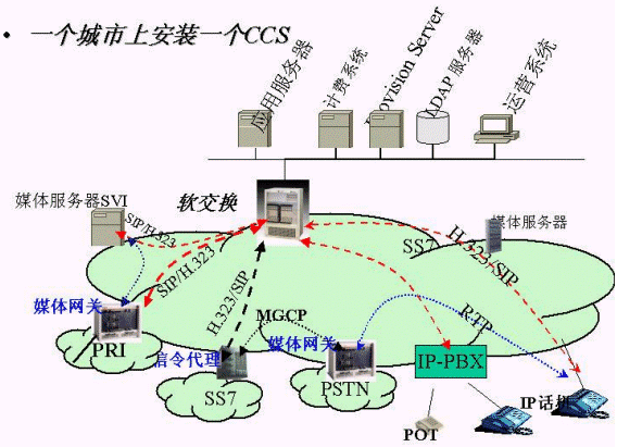 為了完整解決城域網上承載話音業(yè)務,實現(xiàn)IP phone 到PSTN、IP phone 到 IP phone、PSTN 到IP phone的呼叫。新太公司的集成方案中包括以下設備:軟交換核心設備、媒體網關、信令網關、IP PBX、IP 話機、PC IP Softphone、媒體服務器。