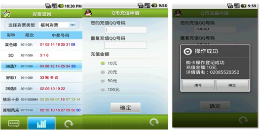 下圖即為彩票投注和Q幣充值操作界面: