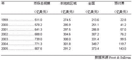 本地或區(qū)域價(jià)格方案在我們預(yù)測的時期內(nèi), 將始終是手機(jī)用戶采納的最多的一種方案。 1999年,在美國有5千7百 萬,大約70%的用戶是采用本地或區(qū)域方案, 而該方案產(chǎn)生的營業(yè)額為274.5億美元, 約占市場總規(guī)模的58.6%。Frost & Sullivan 預(yù)計(jì),到2005年, 46.6%的手機(jī)用戶還會使用該種方案, 而該方案產(chǎn)生的營業(yè)額將為291.2億美元,占市場總規(guī)模的比例將縮至36.1%。