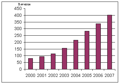 表1表明了2000年至2007年亞太新一代移動(dòng)網(wǎng)絡(luò)市場(chǎng)的收入與增長(zhǎng)率。