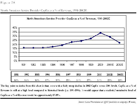 和中國的問題一樣,制造商的問題是電信服務(wù)企業(yè),即運(yùn)營商的投入減少造成的。由于上世紀(jì)末互聯(lián)網(wǎng)和電子商務(wù)泡沫的虛假繁榮的影響,各運(yùn)營商都嚴(yán)重高估了市場需求,認(rèn)為需求是會(huì)隨著通信能力的增強(qiáng)無限增加,因此市場規(guī)模是會(huì)無限擴(kuò)張的,他們?cè)谌狈?duì)最終用戶需求的深入分析的前提下,普遍在基礎(chǔ)設(shè)施的建設(shè)上進(jìn)行了超大規(guī)模的投入,其基礎(chǔ)設(shè)施建設(shè)投入在收入中的比例一度在2000年從平均的15%達(dá)到了創(chuàng)記錄的35%!
