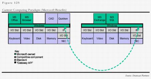 今天,由于業(yè)內(nèi)各企業(yè)普遍明白了控制價(jià)值鏈中操作平臺(tái)和應(yīng)用平臺(tái)的重要性,因此靠壟斷本身來贏利容易受到全行業(yè)的抵制,微軟的策略是在操作平臺(tái)和應(yīng)用平臺(tái)上形成壟斷后,靠應(yīng)用來贏利,這樣大大增加了贏利的隱蔽性,業(yè)界比較容易接受!