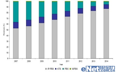 隨著中國經(jīng)濟的高速發(fā)展,企業(yè)通信市場也將保持一定的發(fā)展速度。Frost & Sullivan數(shù)據(jù)顯示,從2007年到2014年,國內(nèi)企業(yè)通信市場年均復(fù)合增長率為5.9%,到2014年市場規(guī)模約為4.82億美元。其中,企業(yè)IP通信市場將保持高速發(fā)展態(tài)勢,年均復(fù)合增長率將達到13.7%,市場規(guī)模將從2007年的1.71億美元增長到2014年的4.19億美元。屆時,IP通信將擁有整個企業(yè)通信市場86.9%的市場份額。傳統(tǒng)的PBX及KTS市場將持續(xù)萎縮。