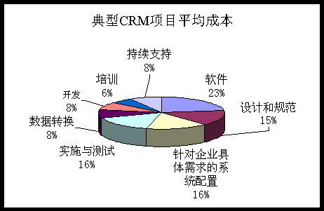 在企業(yè)確定了符合需求的CRM解決方案,包括軟件、供應(yīng)商以及技術(shù)性能之后,仍然有很多其他因素值得考慮。最主要的因素之一即成本。典型的項(xiàng)目的預(yù)算成本中軟件成本占1/3,咨詢、實(shí)施和培訓(xùn)成本占2/3。如下圖所示: