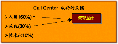 企業(yè)必須牢記在心,成功運(yùn)營(yíng)呼叫中心的三要素 人員、流程和技術(shù),三項(xiàng)缺一不可,而更重要的是如何適當(dāng)?shù)卣线@三項(xiàng)要素。鑒于以往經(jīng)驗(yàn),呼叫中心的成功與否,人的因素占60%,流程因素占30%,而技術(shù)因素只占10%。這并不表示可以忽視技術(shù)的重要性,技術(shù)一樣很重要。如果沒(méi)有當(dāng)今日新月異的科技,企業(yè)便無(wú)法實(shí)現(xiàn)呼叫中心的運(yùn)營(yíng);而成功地實(shí)現(xiàn)呼叫中心有效的管理與運(yùn)營(yíng),關(guān)鍵在于管理能力,也就是對(duì)人員及流程的把握。