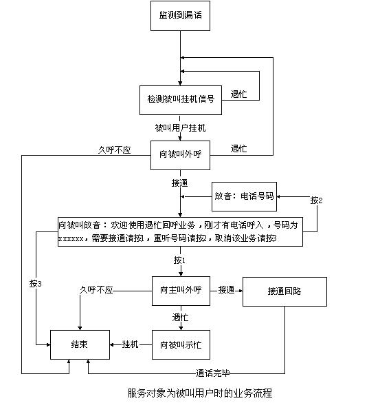 當(dāng)服務(wù)對(duì)象是被叫用戶時(shí),產(chǎn)生遇忙漏話后,東進(jìn)漏話監(jiān)測設(shè)備(DMCS)實(shí)時(shí)檢測被叫用戶的掛機(jī)信號(hào),如果被叫掛機(jī),則先向被叫外呼,呼出接通后,語音提示“歡迎使用遇忙回呼業(yè)務(wù),剛才有電話呼入,號(hào)碼為xxxxxx,需要接通請按1,重聽號(hào)碼請按2,取消該業(yè)務(wù)請按3”,如按1,系統(tǒng)向原主叫外呼(亦稱回呼),回呼成功(ACM)后,建立話音回路,進(jìn)一步接續(xù);如回呼原主叫時(shí)遇忙(SLB、STB等),則回呼失敗,向被叫用戶示忙。