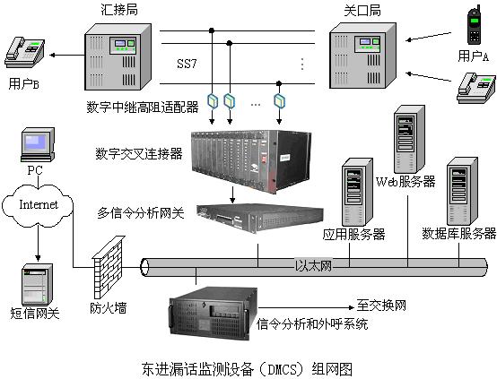 業(yè)務(wù)的組網(wǎng)分為信令網(wǎng)(SS7)和計(jì)算機(jī)網(wǎng)(TCP/IP),兩種異構(gòu)網(wǎng)絡(luò)通過東進(jìn)漏話監(jiān)測設(shè)備(DMCS)中的多信令分析網(wǎng)關(guān)連起來,多信令分析網(wǎng)關(guān)通過數(shù)字中繼高阻適配器和數(shù)字交叉連接器跨接在關(guān)口局和匯接局之間,同時(shí)也接到產(chǎn)生業(yè)務(wù)邏輯的計(jì)算機(jī)網(wǎng)。當(dāng)有外網(wǎng)的用戶A(也可以是本地網(wǎng)內(nèi)的用戶)呼叫網(wǎng)內(nèi)的注冊用戶B遇忙時(shí),東進(jìn)漏話監(jiān)測設(shè)備(DMCS)中的多信令分析網(wǎng)關(guān)檢測到遇忙信號(hào),就開始實(shí)時(shí)監(jiān)測信令網(wǎng)中用戶B的掛機(jī)信號(hào),當(dāng)監(jiān)測到用戶B的掛機(jī)信號(hào)后,就將掛機(jī)信號(hào)轉(zhuǎn)換為基于TCP/IP協(xié)議的包信號(hào),交給計(jì)算機(jī)網(wǎng)上的信令分析和外呼系統(tǒng)進(jìn)行信令分析,外呼系統(tǒng)根據(jù)信令,在業(yè)務(wù)邏輯的控制下,通過交換網(wǎng)外呼用戶A或B,完成業(yè)務(wù)動(dòng)作。