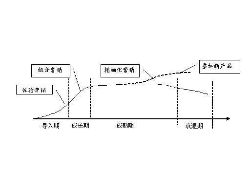 漏話業(yè)務(wù)是對(duì)現(xiàn)有基礎(chǔ)電信業(yè)務(wù)的延伸和補(bǔ)充,是建立在基礎(chǔ)通話服務(wù)基礎(chǔ)上的功能型增值業(yè)務(wù),在業(yè)務(wù)推廣中,應(yīng)根據(jù)業(yè)務(wù)的不同的發(fā)展階段,分別在業(yè)務(wù)的導(dǎo)入期、成長期、發(fā)展期和衰退期采取不同的營銷手段和措施,如下圖所示。