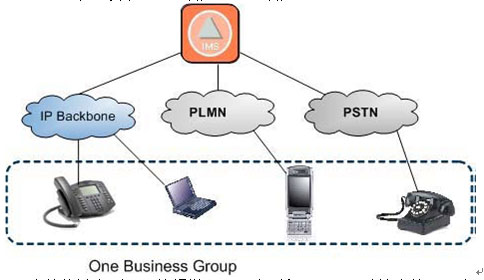 與終端的類型和接入方式無(wú)關(guān)。企業(yè)或集團(tuán)用戶的成員可以使用不同類型的終端, 通過(guò)不同的接入網(wǎng)絡(luò)接入到IMS。在IMS的控制下完成多媒體業(yè)務(wù)的通信過(guò)程,實(shí)現(xiàn)虛擬專用網(wǎng)絡(luò)的應(yīng)用。