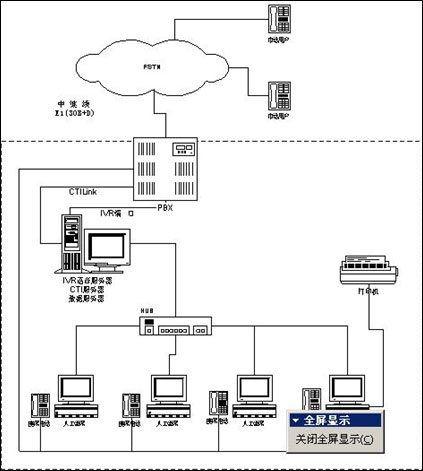 使用Siemens Hicom318交換機(jī),此交換機(jī)接入ISDN中繼線,設(shè)置人工座席分機(jī)及普通分機(jī),為CTI、IVR語音服務(wù)器提供4路IVR端口和CTI LINK控制電纜。
