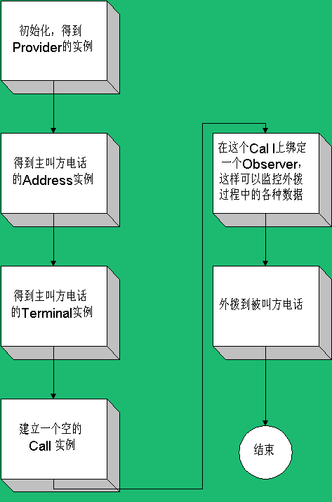 JTAPI利用OBSERVER的概念來(lái)進(jìn)行各種消息處理。OBSERVER直譯過(guò)來(lái)是觀察者的意思,顧名思義,OBSERVER就是對(duì)每個(gè)呼叫對(duì)象進(jìn)行“觀察”工作。它的工作流程是“綁定到專門對(duì)象》觀察專門對(duì)象》獲取專門對(duì)象的信息》分析并匯報(bào)專門對(duì)象的信息”。