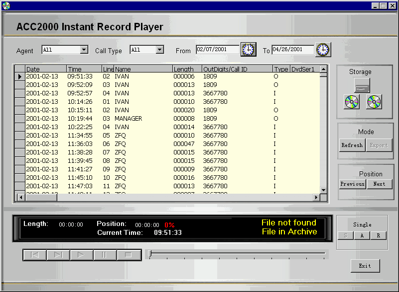 ACC2000 多媒體溝通中心采用最先進的海量存儲設備DVD RAM構建實時多通道語音錄制、備份系統(tǒng)��ACC2000 DVD Record Backup。這個系統(tǒng)可以根據(jù)管理員設定的錄音對象,對符合錄音條件的通話自動進行錄音。