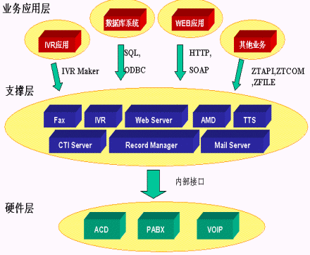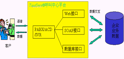 SQL Server,MySQL等多種數(shù)據(jù)庫;通過HTTP調(diào)用第三方WEB程序,通過SOAP協(xié)議調(diào)用Web Server上的服務(wù),從而利用外部應(yīng)用進(jìn)一步加強(qiáng)IVR的功能;用戶只需做一些簡(jiǎn)單配置就可以實(shí)現(xiàn)電話訪問數(shù)據(jù)庫、WEB和業(yè)務(wù)系統(tǒng)。如圖所示: