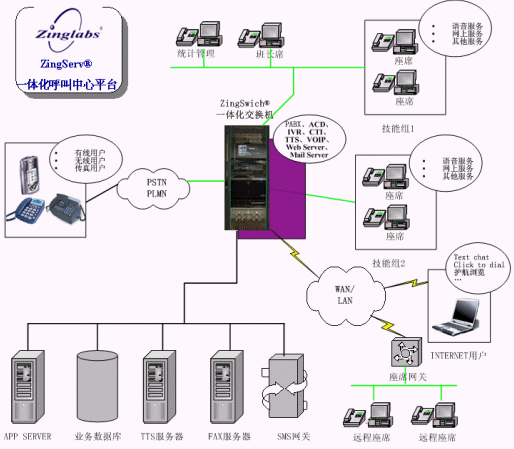 ZingServ®平臺(tái)的WEB呼叫/Chat 功能主要面向Internet用戶,用戶可通過Modem撥號(hào)、DDN專線、ISDN撥號(hào)、局域網(wǎng)、ADSL、Cable