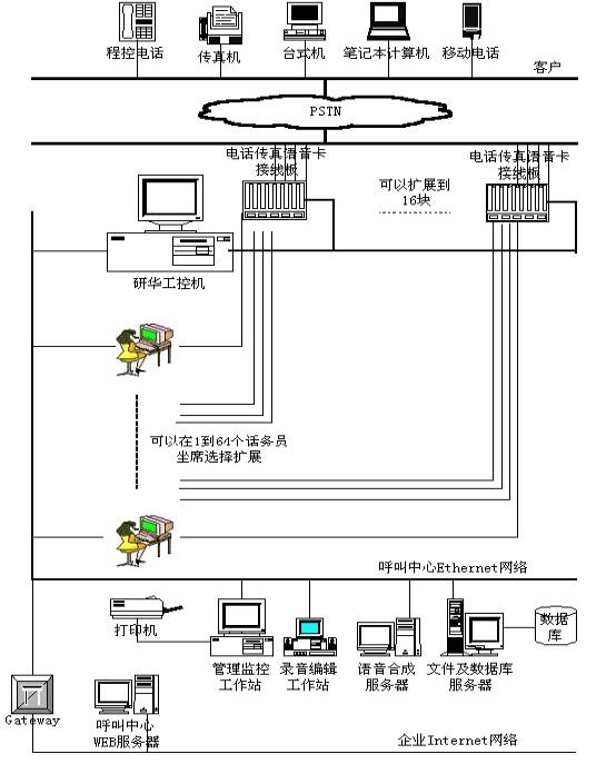 硬件主要由電話接口工控機(jī)(內(nèi)部的安裝電話語音卡)、主服務(wù)器、管理計(jì)算機(jī)、人工坐席計(jì)算機(jī)、電話機(jī)(包括頭戴耳麥)、計(jì)算機(jī)網(wǎng)絡(luò)連接設(shè)備和電話線路連接設(shè)備組成。