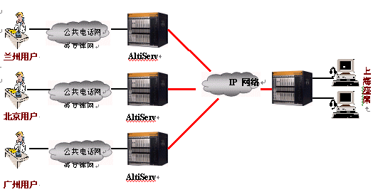奧迪堅(jiān)分布式呼叫中心方案可以分為多對(duì)多(圖1)和多對(duì)一(圖2)兩種形式,但都能夠?yàn)橛脩籼峁┍镜睾艚,異地服?wù)的功能。各個(gè)服務(wù)點(diǎn)之間是對(duì)等關(guān)系或隸屬關(guān)系,它們分布于不同的地理位置,在運(yùn)作時(shí)間、資源、功能上互相協(xié)作,為用戶提供最大限度的服務(wù)。如果基于奧迪堅(jiān)通訊系統(tǒng)的分布式呼叫中心,用戶在北京,廣州或蘭州的任何一個(gè)地方撥打本地的服務(wù)電話,都可以通過IP網(wǎng)絡(luò),自動(dòng)路由到上海的坐席,由上海的坐席來為用戶提供統(tǒng)一的服務(wù),此謂多對(duì)一模式。如果北京、上;驈V州的用戶撥打本地電話后,系統(tǒng)經(jīng)過網(wǎng)絡(luò)排隊(duì)和自動(dòng)路由,被分配到三個(gè)城市中任意一個(gè)正在空閑的或正適合此項(xiàng)服務(wù)的坐席,此謂多對(duì)多。