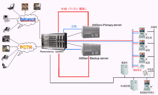 奧迪堅通訊系統(tǒng)有限公司作為CTI通訊平臺的提供商,在技術(shù)上不斷創(chuàng)新,對產(chǎn)品精益求精,尤其體現(xiàn)在對系統(tǒng)的運行安全性的要求上,為了防止電信接入設(shè)備或者企業(yè)網(wǎng)絡(luò)出現(xiàn)故障而造成的呼叫中心服務(wù)中斷,奧迪堅呼叫中心系統(tǒng)提供安全保護冗余切換系統(tǒng),來保障呼叫中心在意外情況下的正常工作,該安全冗余切換系統(tǒng)通過對電源、T1/E1、模擬trunk、分機座席、以及各種網(wǎng)絡(luò)鏈路串口等備份切換來實現(xiàn)可靠的運行。除此之外,奧迪堅系統(tǒng)本身也提供強大的安全保障,由于采用先進IP內(nèi)核一體化設(shè)計,集傳統(tǒng)PBX、CTI服務(wù)器、IVR、ACD、Recording、FAX等眾多設(shè)備于一體,這樣有效的避免了因為外掛設(shè)備過多以及設(shè)備供應(yīng)商的不同而存在的兼容性的問題,從而降低了給呼叫中心系統(tǒng)帶來的的不穩(wěn)定的安全隱患。在系統(tǒng)之外依靠安全保護冗余切換系統(tǒng),可以實現(xiàn)外線、分機、以及各種鏈路接口的雙倍安全運行。如上圖所示:兩臺奧迪堅的呼叫中心服務(wù)器和奧迪堅安全冗余切換系統(tǒng)構(gòu)成呼叫中心熱備份系統(tǒng),在兩臺服務(wù)器中安裝所有的呼叫中心功能模塊。通常情況下由主呼叫中心服務(wù)器提供系統(tǒng)的正常運行,備份服務(wù)器通過安全保護冗余切換系統(tǒng)的服務(wù)監(jiān)測模塊來監(jiān)測主服務(wù)器的各項設(shè)備和鏈路的使用情況,當主服務(wù)器遭遇突發(fā)故障不能繼續(xù)工作時,系統(tǒng)馬上實施自動切換,就會通過安全保護冗余切換系統(tǒng)將系統(tǒng)切換到備份的呼叫中心系統(tǒng)上來,此鏈路可以是數(shù)據(jù)、語音、網(wǎng)絡(luò)、串口等。當安全保護冗余切換系統(tǒng)自身出現(xiàn)斷電或者其他故障時,所有鏈路均保持正常工作狀態(tài)。