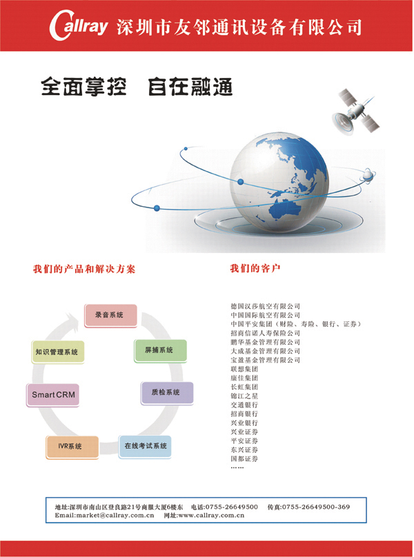 深圳市友鄰?fù)ㄓ嵲O(shè)備有限公司是一家以通訊軟件開發(fā)為主的高科技企業(yè)。主要產(chǎn)品AP Suite是基于呼叫中心的工作質(zhì)量管理系統(tǒng)和軟件,自1997年進(jìn)行產(chǎn)品開發(fā)和市場(chǎng)開拓以來,AP Suite呼叫中心質(zhì)量管理軟件日趨完善,得到廣大行業(yè)客戶的一致認(rèn)同和好評(píng)。到目前為止,該系統(tǒng)已成功應(yīng)用于民航、金融、保險(xiǎn)、證券、電信、公安、電力以及政府等多種行業(yè)、部門。