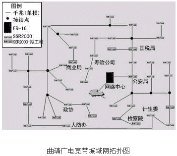 網(wǎng)絡(luò)建設(shè)的第一期工程結(jié)束后,本地多媒體寬帶骨干網(wǎng)以曲靖市政府內(nèi)的機(jī)房作為中心機(jī)房。核心機(jī)房采用支持千兆以太網(wǎng)、SDH及ATM接口的高檔交換式路由器ER-16。主干光纖沿市區(qū)鋪設(shè)成為一個(gè)星形鏈路,以便在不久的將來能夠?qū)⒂?jì)生委和人防辦的光纖連接起來形成一個(gè)環(huán)狀鏈路。市區(qū)內(nèi)共設(shè)43個(gè)光節(jié)點(diǎn),各鄉(xiāng)鎮(zhèn)有一個(gè)光節(jié)點(diǎn),以92條單模光纖直接連入核心機(jī)房的交換式路由器,由此與核心機(jī)房形成一個(gè)星狀拓?fù)浣Y(jié)構(gòu)。