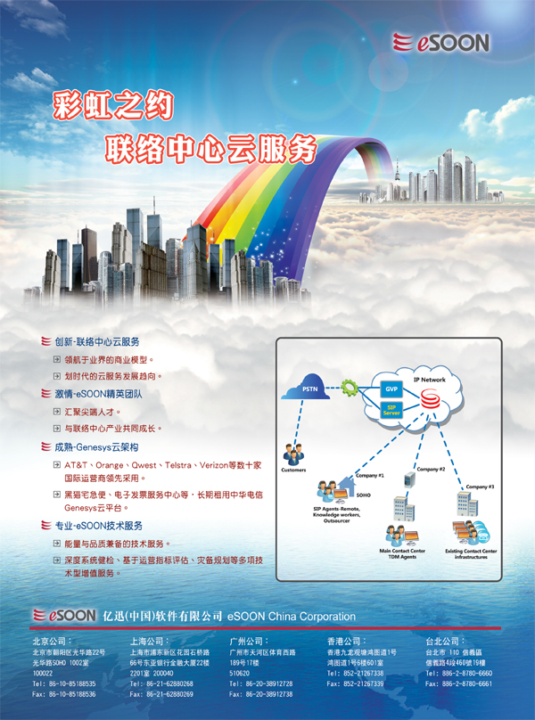 億迅(中國)軟件有限公司:"億迅(中國)軟件有限公司(eSOON)"是eSOON Cayman 集團控股公司與eSOON BVI投資營運公司在中國大陸投資的全資子公司,也是其拓展大中國區(qū)業(yè)務的據(jù)點。自2001年在上海成立至今,已在全國各地14個城市設有分公司或辦事處,為超過350家的客戶提供本地化的呼叫中心系統(tǒng)建設和運營管理的專業(yè)服務,其中不乏橫跨各個領域的頂尖企業(yè)。億迅一直秉承客戶至上的服務精神融入企業(yè)的業(yè)務發(fā)展和日常經(jīng)營中。