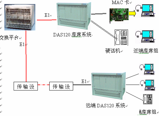 DAS120交換平臺采用1-4個E1連接,可以簡潔實現(xiàn)PCM信號轉(zhuǎn)模擬信號引出到座席。E1接口的信令可選配為隨路信令CAS和透明通道Clear Channel。E1可通過光端機、微波、HDSL等設(shè)備來傳輸,從而實現(xiàn)分布式組網(wǎng)。