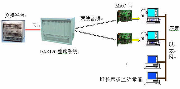DAS120與億景座席卡MAC配合使用,可使系統(tǒng)的優(yōu)越性發(fā)揮到最大。MAC卡提供的強大功能(收發(fā)DTMF和450HZ信號音,語音錄放等)有效地簡化系統(tǒng)軟件的設(shè)計,并可降低系統(tǒng)成本,如EXCEL交換平臺可不用配置DSP卡,IVR可簡化等。還可以有效地降低交換平臺的處理負(fù)荷,提高話務(wù)處理能力。
