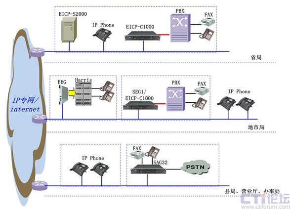 在省局我們采用EICP-S2000或EICP-C1000作為整個(gè)系統(tǒng)的核心服務(wù)器/控制器,并可與原有PBX對(duì)接;在地市局有PBX的地方采用C1000、SEG1或EEG設(shè)備,或用IP話機(jī)直接放號(hào);在縣局、營業(yè)廳、辦事處沒有PBX的地方采用SAG32/SAG8提供模擬用戶接入,或直接采用IP話機(jī)。