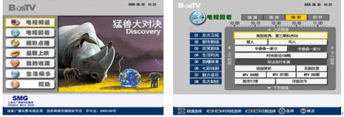 上海IPTV業(yè)務(wù)自2006年9月1日放號(hào)以來(lái),發(fā)展十分迅速。截止10月7日,上海電信IPTV業(yè)務(wù)共計(jì)發(fā)展用戶(hù)達(dá)2.2萬(wàn)。如下是上海IPTV商用系統(tǒng)EPG頁(yè)面: