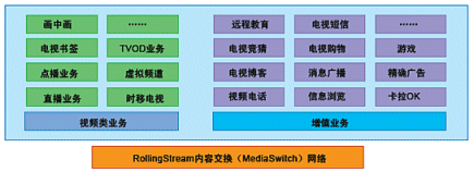 奔流(RollingStream)系統(tǒng)不僅僅支持以L(fǎng)iveTV、Timeshift-TV、VOD、TVOD等為基礎(chǔ)的各項(xiàng)功能,而且具有良好的功能上的可擴(kuò)展性,在此平臺(tái)上可以支持眾多豐富多彩的增值互動(dòng)業(yè)務(wù);诒剂(RollingStream)具有無(wú)限的業(yè)務(wù)增長(zhǎng)空間,如下圖所示意: