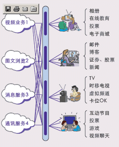 - 豐富多彩的互動(dòng)增值業(yè)務(wù): 可視電話(huà)、電視短信、電視競(jìng)猜、電視投票、游戲、信息瀏覽等