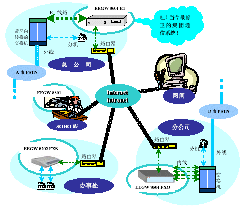 - 在IP網(wǎng)內建立智能交換中心完成兩個異質網(wǎng)PSTN網(wǎng)和數(shù)據(jù)網(wǎng)在本地異地的集成