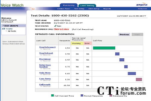 Voice Watch® 是一種主動(dòng)的客戶體驗(yàn)管理解決方案,它從呼叫者的角度來監(jiān)測(cè)端到端語音業(yè)務(wù)和系統(tǒng)設(shè)施的性能–從PSTN接入,通過IVR,轉(zhuǎn)接到人工坐席。Voice Watch發(fā)起有規(guī)律的周期性呼叫測(cè)量承載網(wǎng)的性能、主機(jī)和數(shù)據(jù)庫的響應(yīng)時(shí)間、語音提示的正確性、動(dòng)態(tài)數(shù)據(jù)的準(zhǔn)確度、通話質(zhì)量、呼叫路由、排隊(duì)時(shí)間、屏幕彈出窗口的正確性和及時(shí)性。一旦檢測(cè)到新問題,Voice Watch立即向相關(guān)的技術(shù)人員發(fā)出告警,并報(bào)告性能問題發(fā)生的位置和類型。此外,每一個(gè)監(jiān)測(cè)電話的性能指標(biāo),包括失效事件的語音記錄,可以立即被發(fā)布到Web上以便用戶能夠診斷和修復(fù)緊急問題。用戶還可以使用這個(gè)系統(tǒng)自動(dòng)生成匯總的管理報(bào)告和詳細(xì)的技術(shù)報(bào)告,可以和性能基準(zhǔn)和性能問題相比對(duì),并且有助于把握時(shí)機(jī)持續(xù)改善性能。