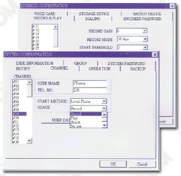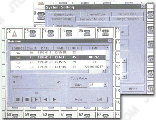 當電話打進來,系統(tǒng)便自動進行錄音,系統(tǒng)把語音信號以數(shù)字化語音格式寫入硬盤。同時系統(tǒng)記錄其通話日期,摘機時間,掛機時間和當前通話時間等信息,如果該次電話為打出電話,還可記錄其打出的電話號碼。掛機時系統(tǒng)便會自動停止錄音。 |
