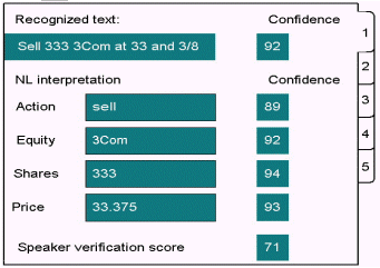 也可使用外部的應(yīng)用知識(shí)內(nèi)容來確定多結(jié)果中的哪一個(gè)是有效的。例如,經(jīng)紀(jì)業(yè)務(wù)應(yīng)用程序,它的用戶投資隨時(shí)間變化而變化。系統(tǒng)可使用簡(jiǎn)單的語法來識(shí)別股票證券的名稱。識(shí)別時(shí),系統(tǒng)產(chǎn)生一個(gè)最佳前N個(gè)股票名稱的清單,標(biāo)明假設(shè)的股票證券名稱。應(yīng)用程序然后將每個(gè)清單項(xiàng)目(由最佳到最差)和現(xiàn)有股票證券名稱進(jìn)行比較,從而為該用戶找到可能性最大的一個(gè)。下圖展示的是這些多結(jié)果情況,每個(gè)結(jié)果都可能有它自身的已被識(shí)別的文本、NL解釋和置信度分值。在這一例中,請(qǐng)求了五個(gè)識(shí)別結(jié)果。