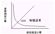 這些錯誤和兩種不同的用戶群有關(guān)。特別是,比如,0.2%的誤接納率,并不意味著0.2%的呼叫者能闖入系統(tǒng),而是0.2%的冒名頂替者企圖闖入。這比例往往只是呼叫者總數(shù)的一個零頭。安全性和方便性須得到折衷平衡。當(dāng)誤接納率接近零時,誤拒絕率則上升,反之亦然。曲線上誤接受和誤拒絕率相等的點叫等錯率(ERR)。
