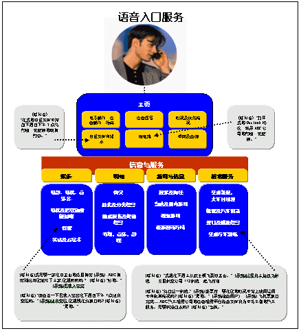 語音入口 是將服務(如統(tǒng)一訊息、長途電話、購物等服務)和基于互聯(lián)網的內容(股市行情、電影、黃頁等)搜集起來。通過撥打一個免費的號碼和一個專用的基于網絡的連接代碼,呼叫者可以進入連接到語音入口服務上。