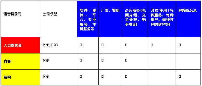 許多語音入口提供商向個人和公司提供語音網上的服務,而內容和結構公司則向這些入口提供商提供技術支持、產品和主機服務。