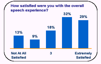 之所以商業(yè)人士選擇自動(dòng)化的語音服務(wù)是因?yàn)樗芴峁└匀粷M意的服務(wù)給客戶,而不是通過麻煩的鍵盤式或按鍵電話式的操作系統(tǒng)。毫無疑問,大多數(shù)的使用者(61%)對(duì)最近使用的語音服務(wù)系統(tǒng)表示了極高的滿意度。