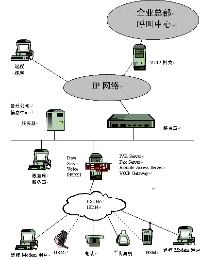 隨著信息技術(shù)的發(fā)展,企業(yè)對(duì)通訊的需求越來越多,并越來越呈現(xiàn)多樣性,有語音通訊,傳真通訊,數(shù)據(jù)通訊等。我們拿銀行作為一個(gè)例子來分析,目前我國大多數(shù)大型商業(yè)銀行都在各個(gè)市(甚至縣)建有一個(gè)IVR交互式語音應(yīng)答系統(tǒng)以滿足其客戶的語音查詢需求;同時(shí),系統(tǒng)也要具備傳真通訊功能,以滿足某些大客戶需要傳真回復(fù)確認(rèn)的需求;目前,各個(gè)商業(yè)銀行也建立了自己的企業(yè)銀行平臺(tái),所以中心也需構(gòu)建一個(gè)接入服務(wù)器來滿足某些大客戶的遠(yuǎn)程撥號(hào)接入進(jìn)行遠(yuǎn)程交易;隨著Call center 應(yīng)用的興起,各商業(yè)銀行的省行呼叫中心需要將其各市行的語音接入平臺(tái)(IVR),通過VoIP 技術(shù),接入到省行的Call Center 中心,從而建立一個(gè)分布式的Call Center,以提高對(duì)其客戶服務(wù)的滿意度 。